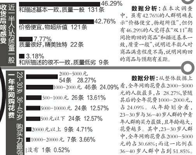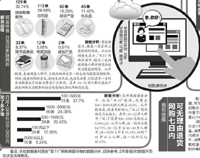 媒體對(duì)這些調(diào)查數(shù)據(jù)逐一分析。結(jié)果顯示,“雙11”期間,西安網(wǎng)購(gòu)人群最愛買衣服,花費(fèi)在500-2000元的人占44.5%。