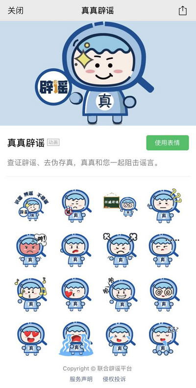 微信表情商店搜索“真真辟謠”,進(jìn)入表情專輯,點(diǎn)擊“使用表情”,即可使用。