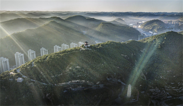 這是2019年8月29日拍攝的被綠色環(huán)繞的陜西省延安市寶塔山(無人機(jī)照片)。新華社記者 陶明 攝