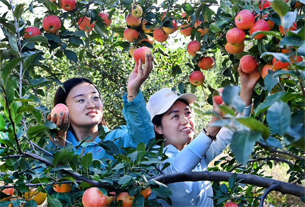 2021年9月10日,游人在陜西省榆林市米脂縣高西溝村蘋果采摘園采摘蘋果。新華社記者 陶明 攝