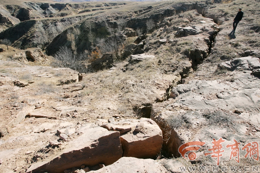神木縣中雞鎮(zhèn)煤礦采空區(qū)地質(zhì)坍陷造成的裂縫長(zhǎng)達(dá)數(shù)公里,因?yàn)榈叵滤魇В乇聿菽究喔伞1緢?bào)記者 鄧小衛(wèi) 文/圖
