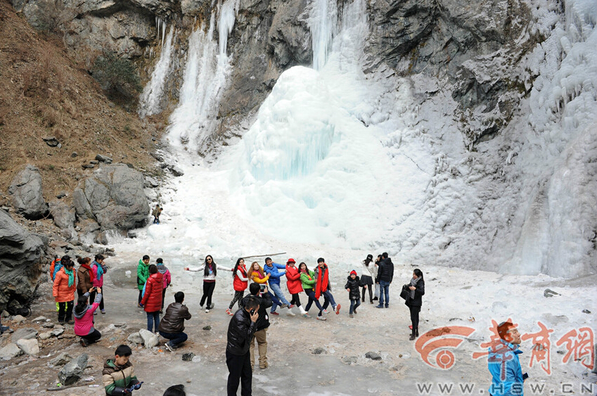 昨日下午2時,游客在戶縣澇峪黑山瀑布前合影留念。不時有冰塊從瀑布上方掉落,著實讓人捏了一把汗 記者 趙彬 攝進(jìn)入冬季后,秦嶺72峪開始出現(xiàn)冰凍瀑布的奇觀,不……