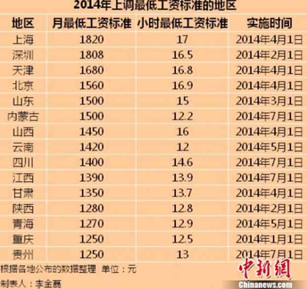 進(jìn)入7月份,四川、江西、貴州和內(nèi)蒙古均上調(diào)了最低工資標(biāo)準(zhǔn)。據(jù)中新網(wǎng)記者不完全統(tǒng)計,截至目前,2014年全國已有15個地區(qū)上調(diào)了最低工資標(biāo)準(zhǔn)。從絕對數(shù)上看,上!