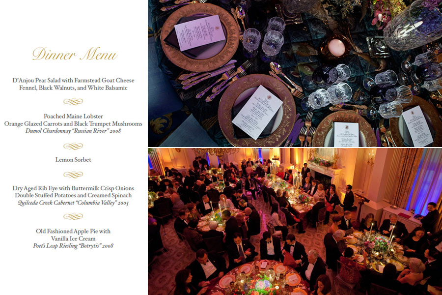 本次晚宴主打菜肴包括水煮緬因州龍蝦、脫脂乳酥洋蔥配干式熟成肋眼牛排等,甜點(diǎn)包括蘋果派和香草冰淇淋;酒是2008年產(chǎn)的“俄國河”酒和2005年產(chǎn)的“哥倫比亞峽谷”酒。