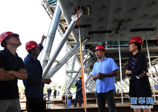 中國電子進(jìn)出口總公司費(fèi)拉茲站建設(shè)項(xiàng)目組經(jīng)理曹虹(右一)和副經(jīng)理焦陽(右二)在位于上海的預(yù)拼裝現(xiàn)場檢查施工進(jìn)度(8月25日攝)。ePR安康新聞網(wǎng)
