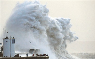 | 1月3日,在英國(guó)波斯考爾,“埃莉諾”風(fēng)暴掀起巨大的海浪。新華社發(fā) |