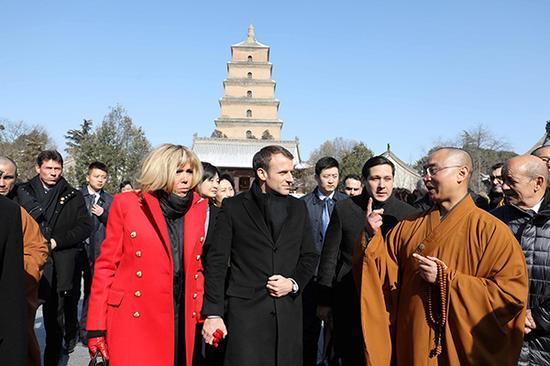 “參觀完兵馬俑后,馬克龍總統(tǒng)一行趕往大雁塔。”陳晨說(shuō)。中國(guó)佛教協(xié)會(huì)副會(huì)長(zhǎng)、陜西省佛教協(xié)會(huì)會(huì)長(zhǎng)、大慈恩寺方丈增勤法師陪同馬克龍總統(tǒng)一行參觀了大雄寶殿,并登上大雁塔;監(jiān)院道宏法師為其介紹了大慈恩寺及大雁塔的歷史傳承和玄奘法師西行求法的精神。分析人士表示,馬克龍此次選擇大慈恩寺、大雁塔作為主要參觀點(diǎn),是因?yàn)槠渑c“絲綢之路”的密切關(guān)系,也表明了馬克龍希望傳遞出歐洲和中國(guó)將在“一帶一路”建設(shè)的框架內(nèi)加強(qiáng)合作的信號(hào)。