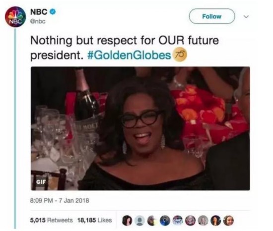 不過這則推文引發(fā)了大量爭(zhēng)議,NBC之后將其刪除,并解釋稱“只是借用頒獎(jiǎng)禮現(xiàn)場(chǎng)的玩笑,并非政治聲明”,但還是不難看出媒體及民眾對(duì)奧普拉的諸多期待。