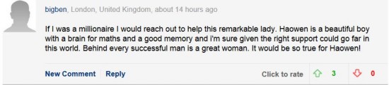 英國(guó)倫敦的網(wǎng)友bigben表示:“如果我能再有錢一些的話,我一定會(huì)幫助這位偉大的女士的。蔣昊文是個(gè)非常聰明的孩子,擅長(zhǎng)數(shù)學(xué),過(guò)目不忘。他如果能夠有更多的幫助,必定能在世上有所作為。常言說(shuō),‘每個(gè)成功的男人背后都有個(gè)偉大的女人’,昊文背后偉大的女人就是他的奶奶!