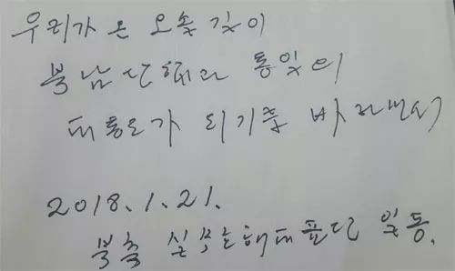 21日,朝鮮三池淵管弦樂團團長玄松月一行前往韓國,為朝鮮藝術(shù)團冬奧會期間赴韓演出提前“踩點”。當晚朝方人員用過晚餐后,玄松月在酒店留言簿寫了一句話:“希望我們走過的羊腸小道,可以成為北南團結(jié)和統(tǒng)一的大路”。署名為“朝方實務(wù)了解代表團全體”。雖然內(nèi)容簡短,卻引發(fā)了韓國輿論的猜測。