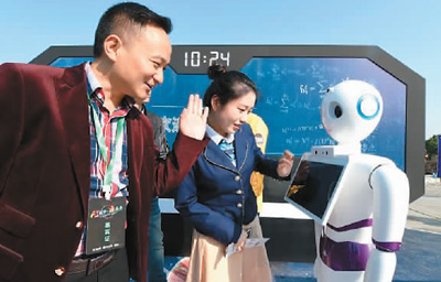 | 圖為科大訊飛(首屆)全球1024開發(fā)者節(jié)展示區(qū)內(nèi),參觀者在和智能語音機器人進行互動體驗。新華社記者 郭 晨攝 |