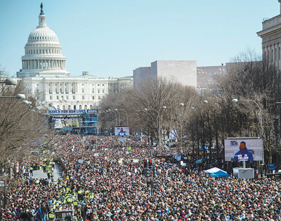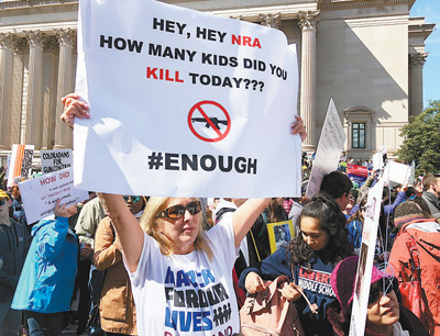 3月24日,來自全美各地的近50萬人涌入美國首都華盛頓,參加以“為了我們的生命”為主題的反對槍支暴力大游行。游行者呼吁美國政府采取更加嚴格的控槍措施,保護校園安全,同時要求政客們不再接受美國全國步槍協(xié)會等團體的政治獻金。這一天,從紐約、波士頓、洛杉磯,再到上月發(fā)生校園槍擊案的佛羅里達州帕克蘭,同一主題的大游行在全美390多個城市同步舉行。美國民眾尤其是青少年學生紛紛走上街頭,響亮地發(fā)出他們的聲音:“面對槍支暴力,我們不再沉默,政客們必須在控槍問題上有所作為!