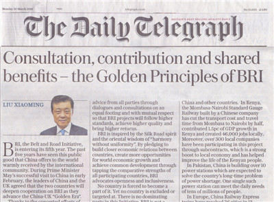 人民網(wǎng)訊 據(jù)外交部網(wǎng)站報(bào)道,2018年3月26日,英國(guó)主流大報(bào)《每日電訊報(bào)》紙質(zhì)版和網(wǎng)絡(luò)版同時(shí)刊登駐英國(guó)大使劉曉明題為《共商共建共享是“一帶一路”的“黃金法則”》的署名文章。全文如下: