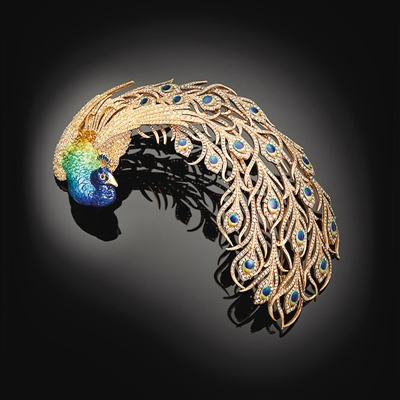 | 阿勒薩尼收藏展中的孔雀圖案羽飾,包含黃金、鉑金、鉆石、琺瑯 |
