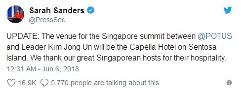 白宮發(fā)言人桑德斯美國當?shù)貢r間5日在推特上表示,特朗普與金正恩將在嘉佩樂酒店舉行會晤。她還感謝新加坡為此次會晤所做的精心準備。據(jù)法新社報道,之所以選定嘉佩樂酒店作為會晤地點,是因為其所在的圣淘沙遠離人口更密集的新加坡本島,易于安保。連接圣淘沙與新加坡本島的僅有一條700多米長的堤道,此外還有纜車,很容易就能將交通完全切斷。