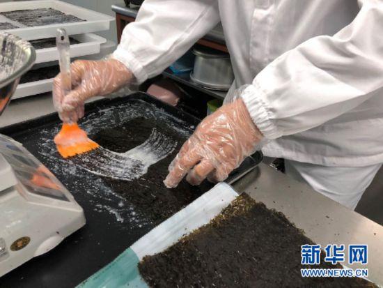 圖為“Kimmaru”工作人員演示制作紫菜干脆片。新華社記者 耿學(xué)鵬 攝