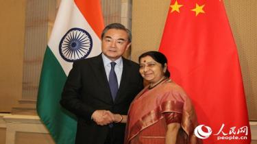 6月4日,國務(wù)委員兼外交部長王毅在南非出席金磚國家外長正式會晤期間會見印度外長斯瓦拉杰。 李志偉攝 人民網(wǎng)比勒陀利亞6月4日電 (記者李志偉……