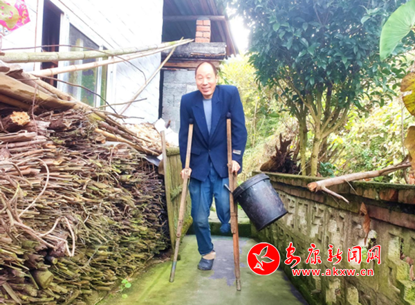 本網(wǎng)訊 (通訊員 商曼 劉靜)立冬節(jié)氣到來(lái),氣溫逐漸下降。早晨還來(lái)不及收拾,戴西春便拄著拐杖,拌豬食、喂豬仔,動(dòng)作嫻熟。看到我們來(lái),他連忙單腿跳著進(jìn)屋拿板凳,招呼我們坐,滿臉笑容。