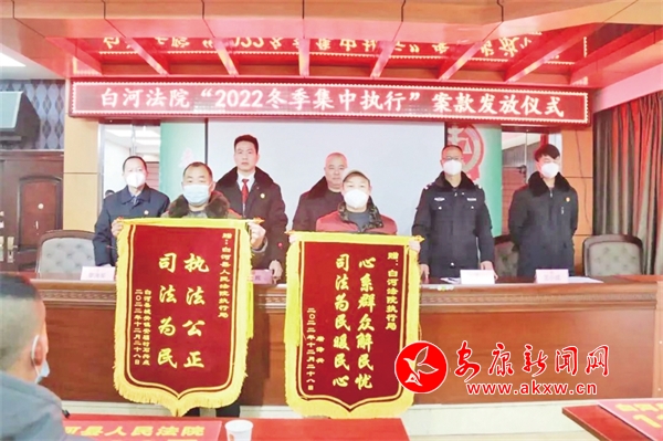 發(fā)放儀式上,通報了白河法院2022年冬季集中執(zhí)行行動開展情況,對國家司法救助條件和程序進(jìn)行了詳細(xì)解讀, 32名申請執(zhí)行人領(lǐng)取了案款發(fā)款牌,發(fā)放儀式井然有序進(jìn)行。據(jù)悉,自2022年11月1日“冬季集中執(zhí)行行動”開展以來,白河法院共執(zhí)結(jié)執(zhí)行案件474件,執(zhí)行到位金額9672.8萬元,共宣布拘留12人,將69人納入失信被執(zhí)行人名單,向78人發(fā)出限制消費令。該院集中執(zhí)結(jié)涉民生案件142件,執(zhí)行到位金額153.2萬元,同時積極爭取資金,為困難申請人落實司法救助資金48.01萬元。