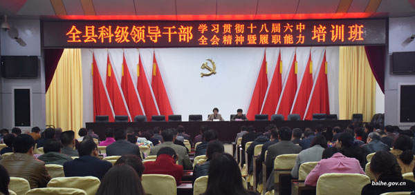 11月16日,白河縣科級領(lǐng)導(dǎo)干部學(xué)習(xí)貫徹十八屆六中全會精神暨履職能力專題培訓(xùn)班正式開班?h委常委、組織部長張吉彩出席開班儀式并講話。各鎮(zhèn)科級領(lǐng)導(dǎo)干部、縣直……