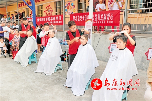現(xiàn)場,通過有獎問答、發(fā)放宣傳資料、設立咨詢臺等形式,向村民進行平安建設、普法、反詐等宣傳。來自漢濱區(qū)陽光愛心護理院的志愿者們?yōu)槔先藗兲峁┙】抵笇А坌娜耸魁徏壮M織的義剪活動也受到了老人們的歡迎,志愿者們免費為現(xiàn)場50多名老人理發(fā)。書法家們現(xiàn)場圍繞“孝義”主題進行創(chuàng)作,并贈送給群眾。演出結(jié)束后,近百名老人到社區(qū)的孝義食堂參觀和免費用餐。