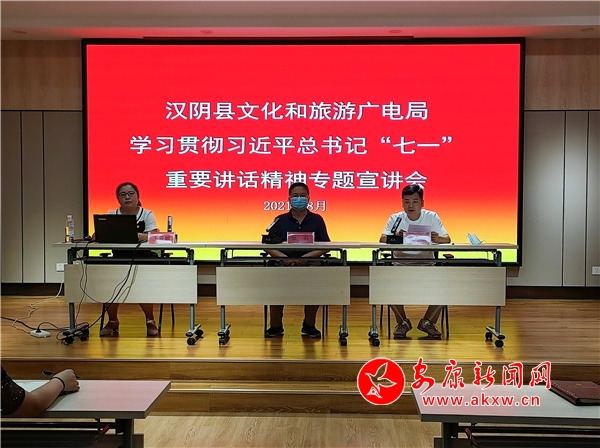 本網(wǎng)訊(通訊員 成濤)為深入學(xué)習(xí)宣傳貫徹習(xí)近平總書(shū)記在慶祝中國(guó)共產(chǎn)黨成立100周年大會(huì)上的重要講話精神,引導(dǎo)廣大黨員干部深刻領(lǐng)會(huì)把握“七一”重要講話的重大意義。8月11日下午,漢陰縣文化和旅游廣電局舉辦學(xué)習(xí)貫徹習(xí)近平總書(shū)記“七一”重要講話精神專題宣講會(huì)。