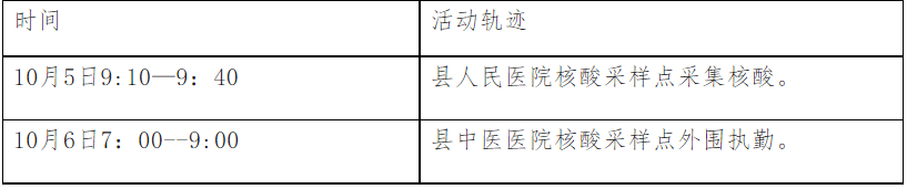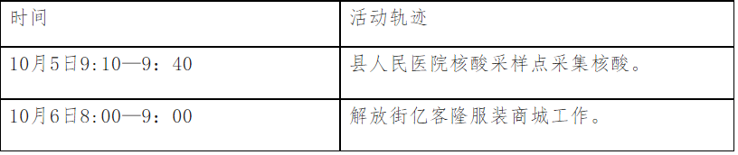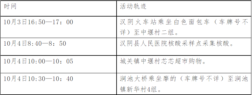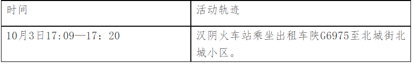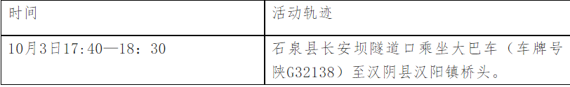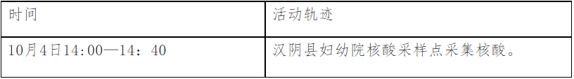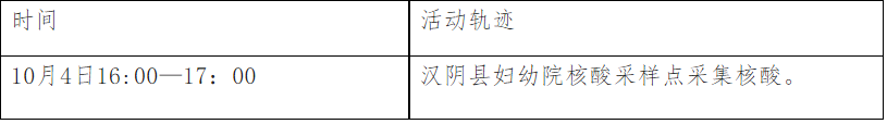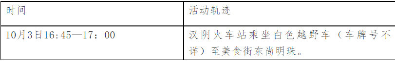 根據(jù)流調(diào)情況,現(xiàn)將漢中一例初篩陽性病例涉及密切接觸者在漢陰縣公共場(chǎng)所活動(dòng)軌跡公布如下: