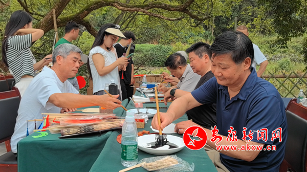 活動現(xiàn)場,8位漢陰本土?xí)覔]毫潑墨、筆走龍蛇,為到場嘉賓和游客書寫、贈送書法作品,案幾前擠滿圍觀人群。一幅幅寓意美好、字體優(yōu)美、散發(fā)著墨香的書法作品,引得眾人連連稱贊,紛紛拍照打卡。