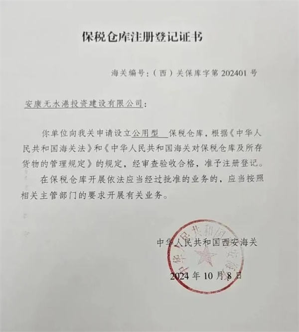 10月8日,由恒口示范區(qū)申請(qǐng)?jiān)O(shè)立的“公用型保稅倉庫”正式通過海關(guān)審查驗(yàn)收,成功獲得由西安海關(guān)頒發(fā)的《保稅倉庫注冊(cè)登記證書》,標(biāo)志著該保稅倉已具備正式運(yùn)營(yíng)資質(zhì)和能力,可正式對(duì)外開展實(shí)際業(yè)務(wù)。