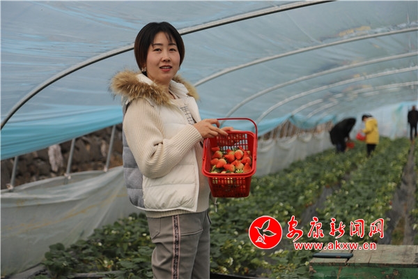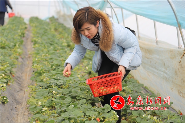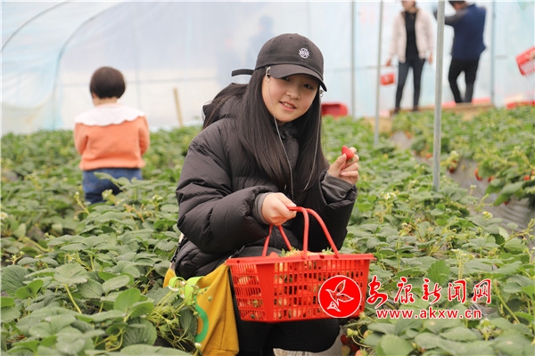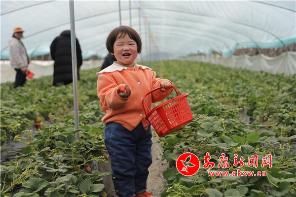 “媽媽,這里的草莓真得好甜。”一個剛進大棚里采摘的小朋友欣喜地喊著。