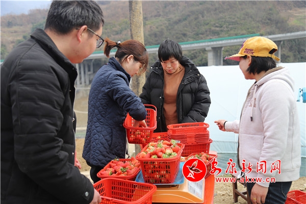 前來采摘草莓的人絡(luò)繹不絕。在采摘園區(qū),筆者看到不少游客興高采烈地提著剛采摘的草莓,排隊稱重。4位客人在棚里吃了草莓,覺著口感不錯,就一次買了1000多塊錢的草莓滿載而歸。