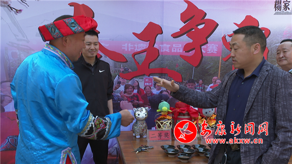 距離鄉(xiāng)愁館不遠(yuǎn)的摔碗酒比賽現(xiàn)場熱鬧非凡,一位身著地方特色服飾的村民與游客劃拳定輸贏,游客贏了便能免費(fèi)得到一壇嵐皋陳釀,游客輸了便要喝摔碗酒一碗,不管輸贏與否,都能引起在場群眾的陣陣歡笑。