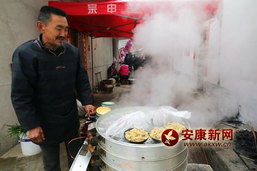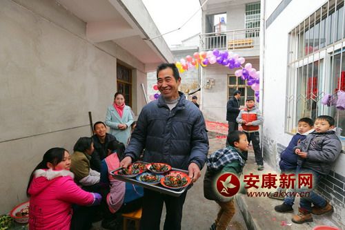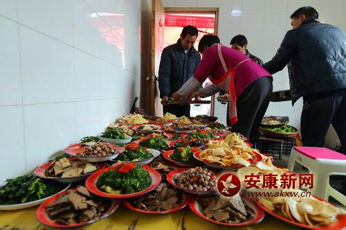 這時,新郎家是最熱鬧的,為了辦好婚禮,附近的親朋好友一一前來幫忙和捧人氣。新郎的家里搭起了氣球彩門,紅紅的對聯(lián)和喜字分別貼在窗戶和門上,院壩里架起了大蒸籠,八大碗早就上了籠,涼菜在案板上整整齊齊的一溜溜擺著;ㄉ、瓜子、糖果一一擺在屋子里、院壩里的十來張大圓桌上。按照墻上貼著的執(zhí)事單的安排,廚房、客廳、禮房等每個角落的人都在干著自己的事情。寒冬里的婚禮,沒有人喊累,嚴(yán)寒在這一刻被驅(qū)散。