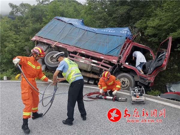 受西漢高速路面養(yǎng)護(hù)施工,貨車(chē)實(shí)施交通管制影響, 210國(guó)道貨運(yùn)車(chē)輛激增,交通安全形勢(shì)突然嚴(yán)峻。7月17日中午13時(shí)許,一輛倉(cāng)柵式輕型貨車(chē)滿(mǎn)載一車(chē)貨物,由成都沿210國(guó)道前往河南,行駛至210國(guó)道1392公里+100米處與道路左側(cè)山體碰撞,車(chē)頭被撞癟,駕駛員下半身被卡在駕駛室無(wú)法脫困,生命垂危。副駕駛被甩出車(chē)外。接警后廣貨街中隊(duì)迅速出警,第一時(shí)間趕到現(xiàn)場(chǎng),迅速組織各救援單位開(kāi)展施救。隨后,醫(yī)護(hù)人員、消防官兵、保險(xiǎn)業(yè)務(wù)員先后到達(dá),四家單位有條不紊地聯(lián)合救援即刻展開(kāi)。交通警察對(duì)事故路段臨時(shí)性實(shí)施交通管制,防止發(fā)生次生事故。同時(shí)配合消防官兵對(duì)卡在車(chē)內(nèi)的駕駛?cè)诉M(jìn)行施救。醫(yī)護(hù)人員對(duì)傷員進(jìn)行前期救治,包扎、輸液、輸氧。保險(xiǎn)公司派出救援車(chē)輛對(duì)遺散的貨物進(jìn)行收集,對(duì)受困車(chē)輛進(jìn)行施救。歷時(shí)兩個(gè)小時(shí),受困人員被救出,送醫(yī)院治療。