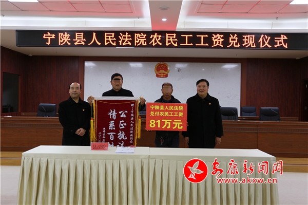 2020年11月25日,當(dāng)接到寧陜法院執(zhí)行局領(lǐng)取工資的通知后,崔某激動(dòng)不已,一大早從佛坪縣西岔河鎮(zhèn)趕到寧陜法院,領(lǐng)取了全部案款812943元,并當(dāng)庭贈(zèng)送錦旗一面,上書(shū)“公正執(zhí)法、情系百姓”,他連連說(shuō):“真心感謝寧陜法院,幫我要回了拖欠的工資”。