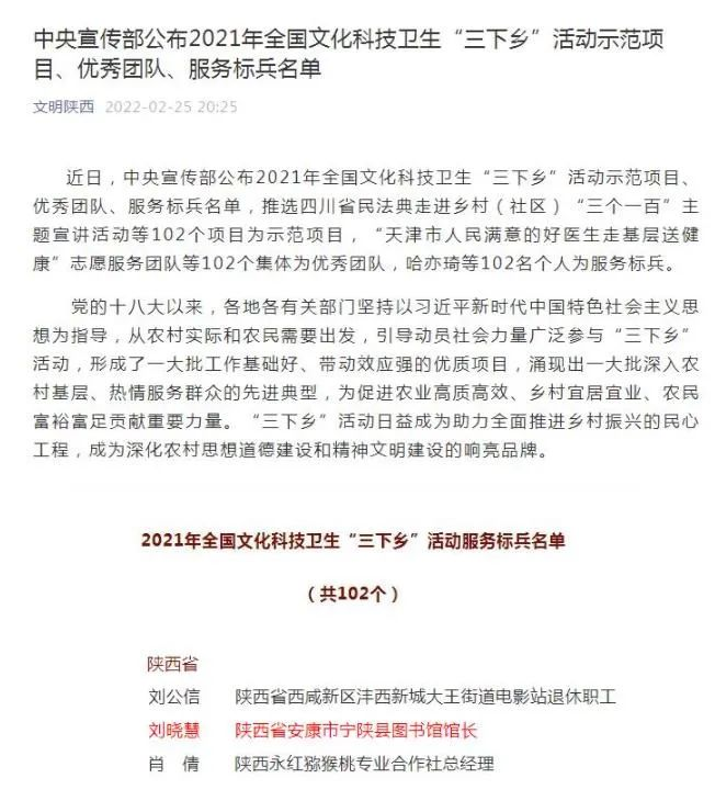 近日,中央宣傳部公布2021年全國文化科技衛(wèi)生“三下鄉(xiāng)”活動示范項目、優(yōu)秀團隊、服務標兵名單,推選四川省民法典走進鄉(xiāng)村(社區(qū))“三個一百”主題宣講活動等102個項目為示范項目,“天津市人民滿意的好醫(yī)生走基層送健康”志愿服務團隊等102個集體為優(yōu)秀團隊,哈亦琦等102名個人為服務標兵。其中,寧陜縣圖書館長劉曉慧獲評2021年全國文化科技衛(wèi)生“三下鄉(xiāng)”活動服務標兵。S58安康新聞網(wǎng)