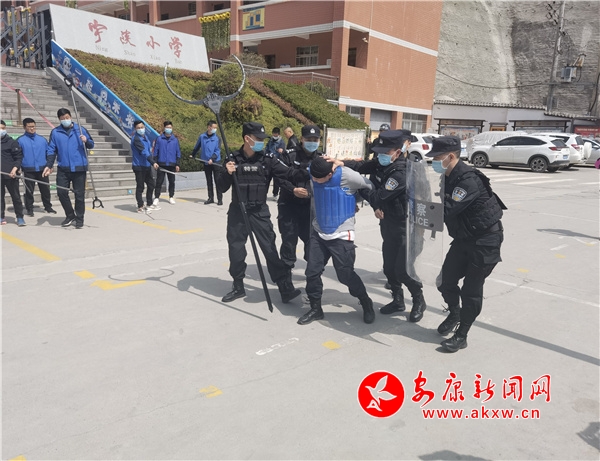 演練開始,下午1點(diǎn)30分,入校音樂響起,兩名校警、家長護(hù)衛(wèi)隊(duì)、值班老師站在校門口執(zhí)勤,大部分學(xué)生已進(jìn)入校園,還有十幾名學(xué)生正在排隊(duì)等待入校。此時(shí),在學(xué)校旁邊閱讀吧門口徘徊的一名身份不明的“歹徒”突然舉著砍刀沖向校門口,企圖闖入校園,值班校警見狀立即啟動一鍵式報(bào)警向公安部門求助,值班老師快速做出反應(yīng),拉響學(xué)校警報(bào),關(guān)閉伸縮門,組織未入校的學(xué)生趕往緊急避難場地躲避。同時(shí),校警和值班老師手持器械,在校門口對“歹徒”進(jìn)行阻擊,拖延時(shí)間。