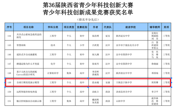 本網(wǎng)訊(通訊員 李小杰)日前,陜西省第36屆青少年科技創(chuàng)新大賽獲獎名單公布,寧陜中學申報的4項科技創(chuàng)新成果全部獲獎,其中:高二(2)班王梓俊、王鈜偉同學的《基于AOA協(xié)議的野外通訊與救援求生系統(tǒng)》項目榮獲一等獎,并被推薦參加全國第36屆青少年科技創(chuàng)新大賽,又一次入圍全國大賽。高二(5)班學生王國棟的《拓撲網(wǎng)絡構建與海明校驗的實驗探究》榮獲二等獎、高三(4)班學生段永橘的《全球日期變更演示模型》榮獲三等獎、高三(4)班學生沈子怡的《快速軟化獼猴桃的“妙招”》榮獲優(yōu)秀獎。獲獎項目涵蓋工程學、計算機科學、地理學和植物學等多學科領域。