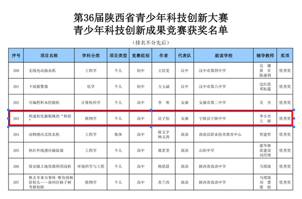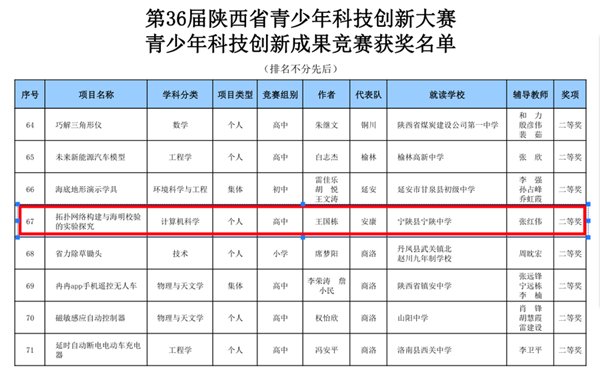 據(jù)悉,陜西省第36屆青少年科技創(chuàng)新大賽由省科協(xié)、團省委、省婦聯(lián)共同主辦。大賽分青少年科技創(chuàng)新成果競賽、科技輔導員創(chuàng)新成果競賽、青少年科技實踐活動、青少年科技創(chuàng)意比賽、少年兒童科學幻想繪畫比賽等五個類別。全省高中組青少年科技創(chuàng)新成果競賽共評出108個獎項,其中一等獎9項,被推薦參加全國大賽僅7項。我校兩名學生的科技創(chuàng)新項目榮獲一等獎,并拿到參加全國大賽通行證實屬不易,彰顯了學?萍紕(chuàng)新特色發(fā)展的強大實力。