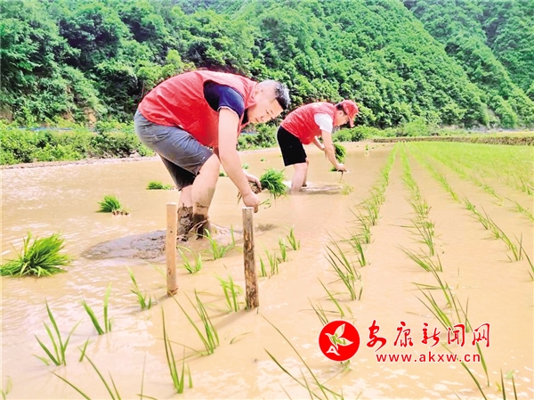 本網(wǎng)訊(通訊員 陳陽(yáng)軍)農(nóng)忙時(shí)節(jié)不等人。不久前,地處秦嶺腹地的寧陜縣龍王鎮(zhèn)棋盤(pán)村,有一群人,他們身穿“紅馬甲”搶抓好時(shí)節(jié)移栽秧苗,在水田里來(lái)回穿梭,幫助村民把一株株秧苗整齊有序地插入水田里,在藍(lán)天白云的映襯下,田間地頭呈現(xiàn)出一幅忙碌的夏耕畫(huà)卷。