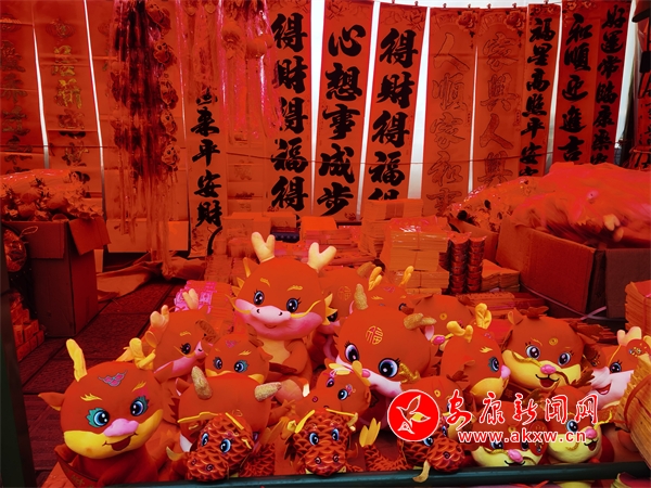 攤主劉女士說(shuō):“雖然今年過(guò)年時(shí)間比較晚,但是我們的年貨已經(jīng)早早備齊了,最近大家買(mǎi)對(duì)聯(lián)的熱情高漲,在新的一年祝愿大家龍年行大運(yùn)、發(fā)大財(cái),龍年吉祥。”
