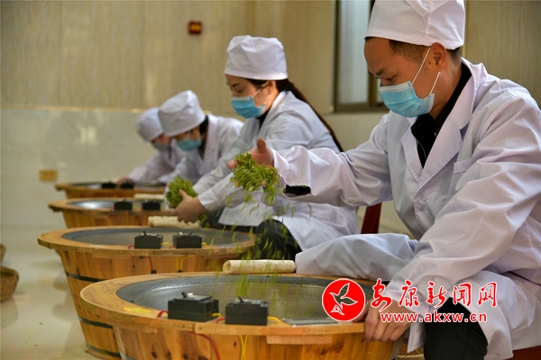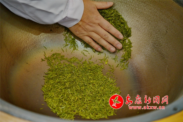 在綠茶生產(chǎn)車間,陣陣茶香撲面而來(lái),沁人心脾。嫩綠的茶芽在制茶師們手中翻飛,炒鍋中響起“噼噼啪啪”的聲音,熱氣縷縷升騰,只見制茶師施展抖、悶、揚(yáng) 、理?xiàng)l、壓、翻等手工制茶動(dòng)作,鮮嫩的茶芽通過(guò)殺青、做形、烘干后根根緊直似針,翠綠養(yǎng)眼的新茶即誕生“出爐”。