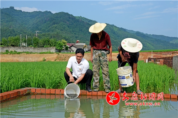 “我家去年種了3畝水稻,投放了50斤魚苗,養(yǎng)大后以40元一斤的價格賣了2000多元,其余的都分給親戚朋友嘗鮮了。我看到效果不錯,今年便多種了兩畝水稻,準備多投放一些魚苗。”領了4桶魚苗的村民賈文林一邊往自家田里放著魚苗一邊說道。