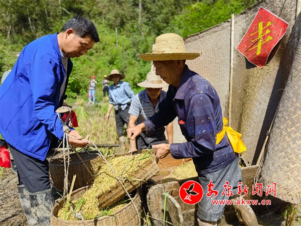 在簡短的開鐮儀式后,水稻收割正式開始,紅黃兩隊(duì)競相角逐。只見金黃的稻田中,村民手持鐮刀一字排開,迅速揮舞著手中的鐮刀,將金黃的稻秧割下并整齊堆放。緊接著兩人一組,交叉替換地將手中的稻秧在拌桶里反復(fù)甩打脫粒,拌谷聲“嘣嘣嘣嘣”有節(jié)奏的作響,一片豐收景象,聲勢頗為壯觀。
