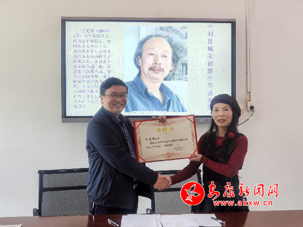 本網(wǎng)訊(通訊員 黃燕)3月18日,平利縣城關(guān)初級中學(xué)舉辦“中國畫壇百杰、平利籍畫家吳光明”書畫作品捐贈儀式。吳光明委托其外甥女王小茜將《黃河的傳說》《天柱地軸》《恒山深處多仙家》等11幅作品捐給城關(guān)初級中學(xué)。
