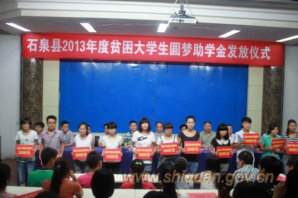 8月28日,石泉縣在縣青少年活動中心一樓會議大廳隆重舉行2013年度大學新生圓夢助學金公開發(fā)放儀式?h政協(xié)主席李平、縣政府副縣長唐錫富和劉海峰、縣總工會主席張詩泉以及縣教體局、民政局、扶貧局、移民局、計生局、團縣委負責人和安康市興安地產(chǎn)集團第三分公司總經(jīng)理孫峰等愛心人士出席了公開發(fā)放儀式。各相關部門及單位具體辦理貧困大學生資助工作的負責同志和享受圓夢資助的貧困家庭學生及部分家長代表參加了公開發(fā)放儀式。與會領導向受資助學生現(xiàn)場發(fā)放了圓夢助學金,兌現(xiàn)了縣委、縣政府作出的“決不讓一個考生因家境貧困而上不起大學”的莊嚴承諾?h政府副縣長劉海峰介紹了2013年貧困大學生資助工作情況和受資助大學生名單,受資助學生及家長代表分別作了真摯感人的發(fā)言,縣政協(xié)主席李平同志在講話中對受資助的大學生提出了殷切希望,勉勵他們發(fā)奮學習,立志成才,將來為改變家鄉(xiāng)的貧困面貌做出貢獻!