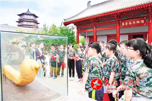 由三個村合并而成的池河鎮(zhèn)明星村,擁有6000多畝桑園,通過經(jīng)濟(jì)合作、村民入股方式成立旅游公司,依托蠶桑產(chǎn)業(yè)和蠶桑文化,成功打造“滄海桑田”景區(qū),實現(xiàn)了“桑園變景點、民居變民宿、農(nóng)民變股民”的蛻變。養(yǎng)蠶時節(jié),許多學(xué)生都會來到明星村研學(xué)旅行,了解鎏金銅蠶故事,體驗摘桑養(yǎng)蠶。