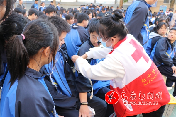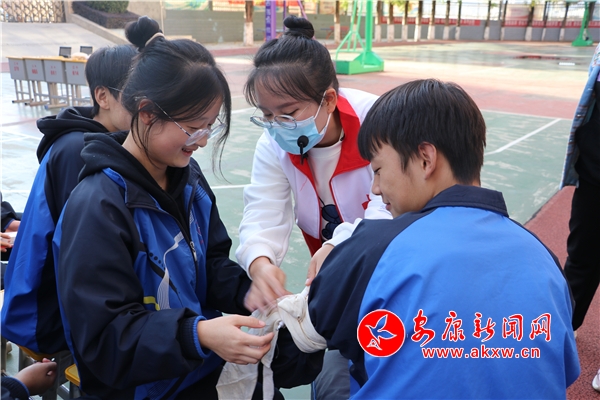 活動(dòng)中,縣紅十字會(huì)工作人員向?qū)W生發(fā)放了三角巾,現(xiàn)場(chǎng)向?qū)W生講解了三角巾的結(jié)構(gòu)和各部分的功能,并以手臂、肩部和胸部三個(gè)部位受傷為例做了操作示范,手把手地指導(dǎo)學(xué)生如何包扎、如何敷料、如何固定、如何打結(jié)。同學(xué)們邊觀察邊實(shí)操,不時(shí)和工作人員進(jìn)行互動(dòng),尋求專業(yè)指導(dǎo),親手體驗(yàn)三角巾包扎的操作流程,在鍛煉動(dòng)手實(shí)踐能力的同時(shí),掌握身體受傷的應(yīng)急處理技能,增強(qiáng)應(yīng)對(duì)突發(fā)事件的自護(hù)自救和科學(xué)救護(hù)能力。