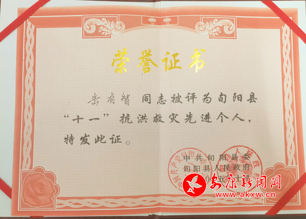 而岳有智也用自己的實際行動真正詮釋了軍人“退伍不褪色”的內涵,被組織表彰為“抗洪救災先進個人”。