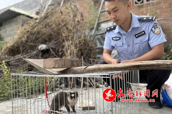 當(dāng)日中午,呂河派出所接到群眾報(bào)警稱,“在其家中鐵籠里關(guān)了一只像果子貍的野生動(dòng)物,請(qǐng)求幫助。”接警后,值班民警迅速帶隊(duì)前往處置。到達(dá)現(xiàn)場(chǎng)后,民警看到了這只“不速之客”,是一只灰褐色皮毛的小動(dòng)物,臉?biāo)坪焖曝i,花白面,時(shí)不時(shí)上躥下跳,身體狀況還不錯(cuò)。民警經(jīng)過仔細(xì)比對(duì)和觀察,并經(jīng)林業(yè)部門工作人員確認(rèn),發(fā)現(xiàn)該動(dòng)物并非果子貍,而是一只鼬獾,屬于國(guó)家三級(jí)保護(hù)動(dòng)物。